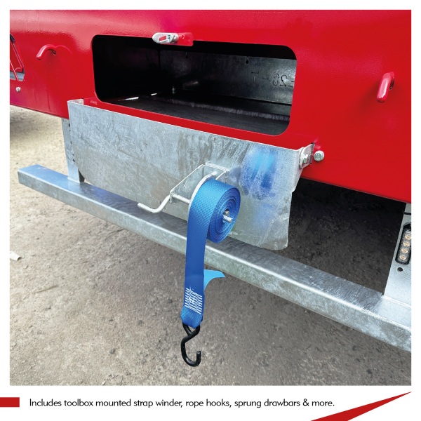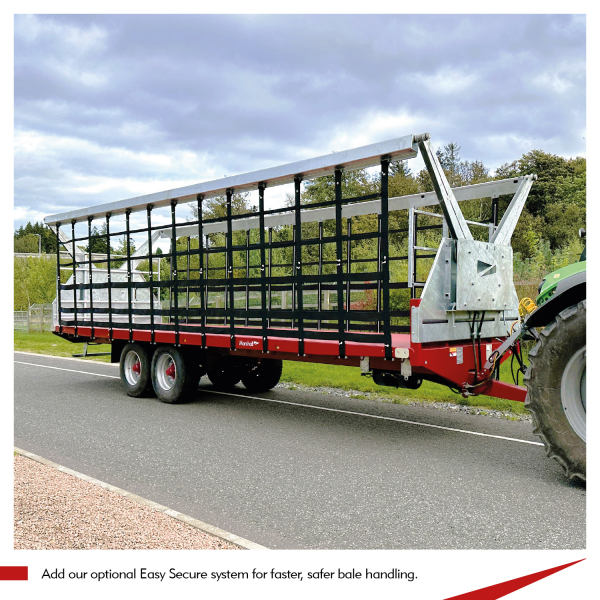 Our trailers are also designed with practicality in mind. Integrated features include best-in-class rope hooks, numerous ratchet-strap points, strap winders and a variety of tool and storage box options. There’s also the option to choose from different harvest ladder styles and add our bespoke 2.3m two-bale high or 3.1m three-bale high Easy Secure bale clamp system, that helps to make bale handling as efficient and stress-free as possible.