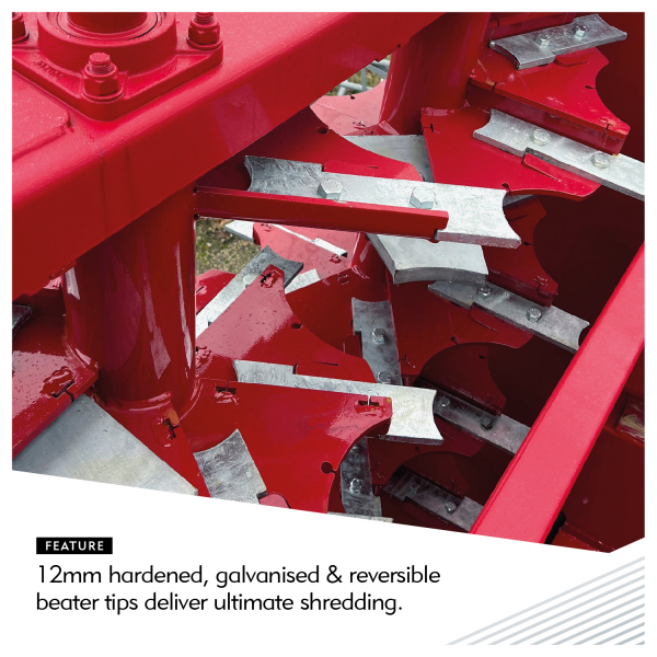 - 12mm hardened, galvanised & reversible beater tips deliver long life, excellent shredding and a consistent spread pattern (especially on grassland ahead of mowing).