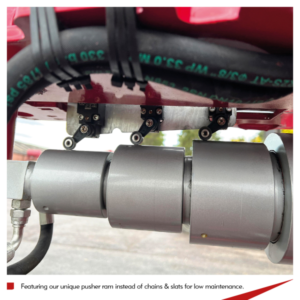 - Featuring our unique pusher ram instead of chains & slats, for low maintenance.