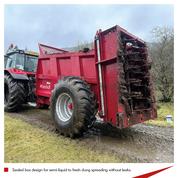 - Sealed box design for semi-liquid to fresh dung spreading without leaks.
