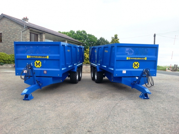 These two bespoke QM/12 grain trailers were built for a customer on one of the Channel Islands. Accordingly the trailers were designed to be a maximum of 7' 6" wide to meet the islands' road legislation. The trailer had 400-60x22.5 flotation tyres, springs, a spring drawbar, hydraulic door, bolt-on mudguards, a front perspex window with a bolt-in grill and were finished in Newholland blue.